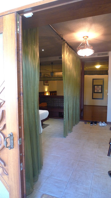 左半部是一張雙人床的部份。右半部是一個客廳。